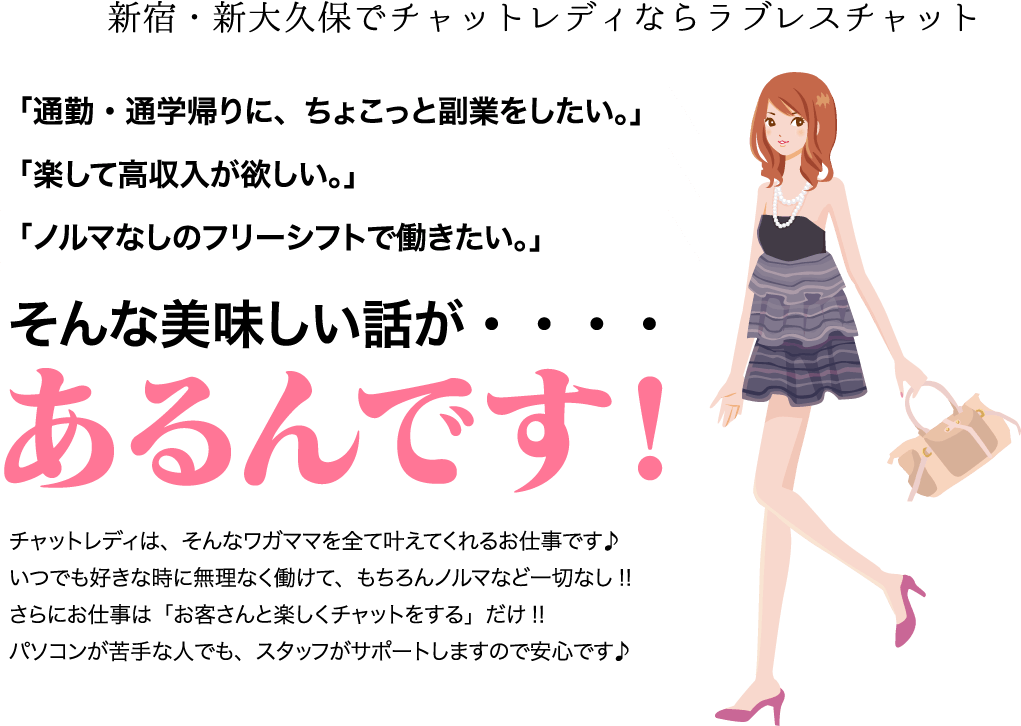 ノルマも罰金もないので、時間が空いた時に好きなだけお仕事が出来るので、いつでも稼ぐ事が出来ます。しっかり稼ぎたい派の人は、定期的にログインをしてこまめなチャットをしていくことが大切ですし、気ままにお仕事したい派の人は、空いてる時間を使って好きなタイミングに好きなだけ働けるのがチャットの魅力です。